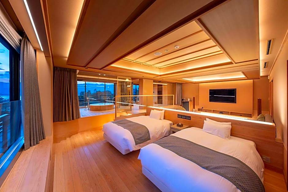 This twin room's standout features are the private open-air bath and sauna. The twin room includes a private bathroom, well-fitted with a bath, a shower, a bidet, a hairdryer and slippers. The spacious air-conditioned twin room provides a flat-screen TV, a tea and coffee maker, executive lounge access, a wardrobe as well as sea views. The unit offers 5 beds.